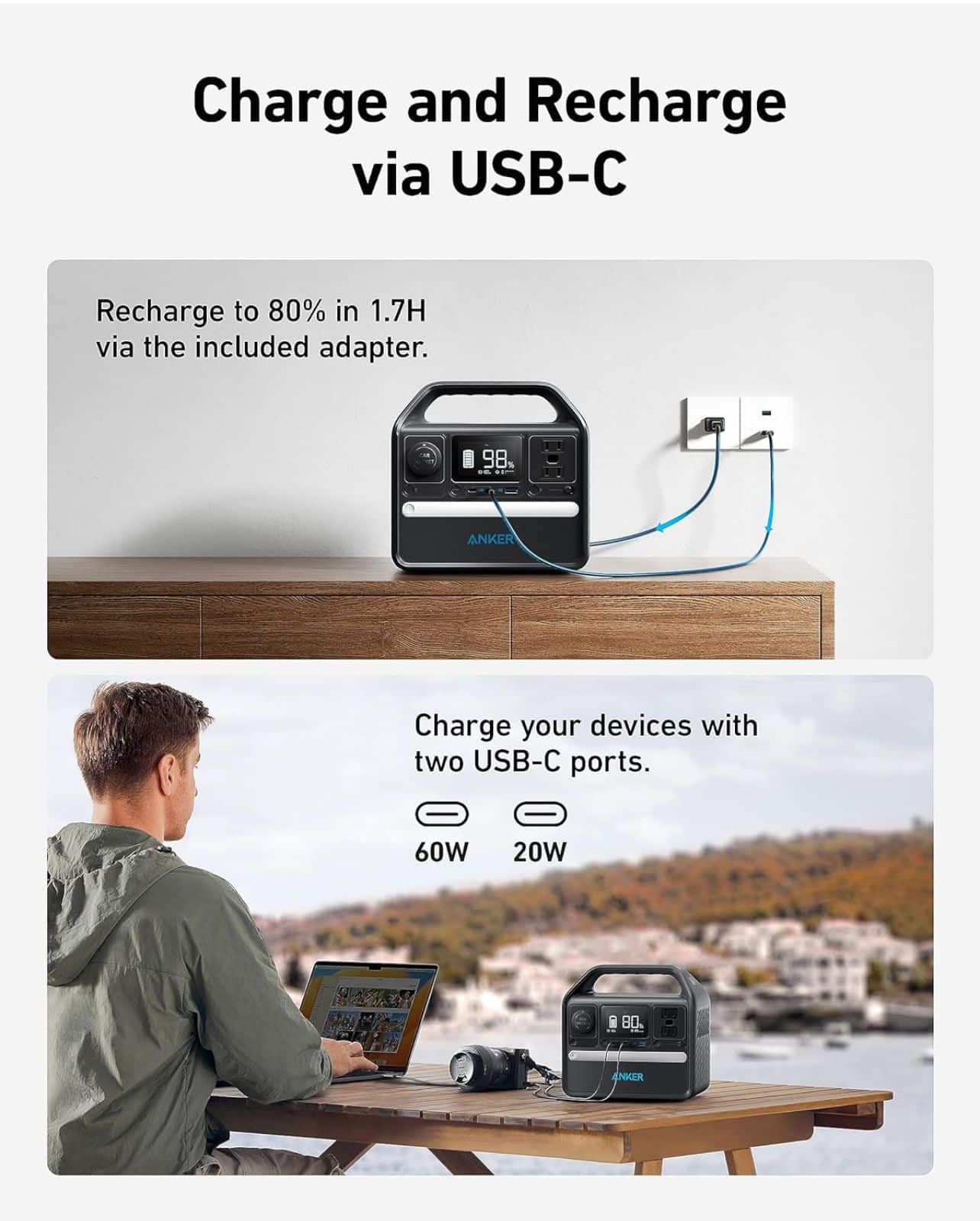 6 Ports for Charging at Once: The Anker 522 features 2 AC outlets, 2 USB-C ports, a USB-A port, and a car outlet. Charge up to 6 devices simultaneously, wherever you are.