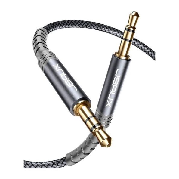 كابل JSAUX AUX 3.5 مم بطول 3 متر – رمادي، بتصميم نايلون مجدول متين لنقل صوت نقي بدون تشويش، مثالي لتوصيل الموبايل بالسماعات أو السيارة.