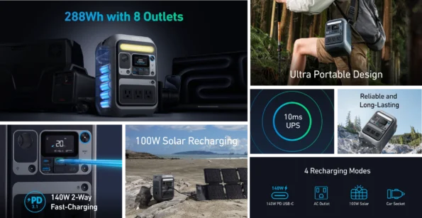 - Charging Options: You can recharge the power station using a wall outlet (80% charge in just 50 minutes), solar panels (up to 100W), a car, or the PD 3.1 USB-C port.
