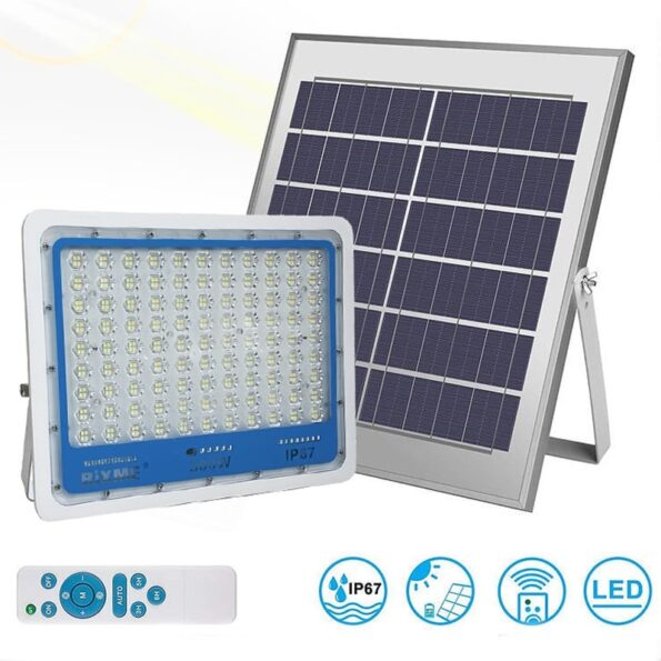 300W, 3000K-6000K, solar panel 40, size: 700x350x17mm, lamp: 340x280x80mm, battery: 40000mAh/3.2V, IP67, 8h lighting, 5h charge, 36000lm, remote.