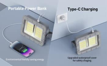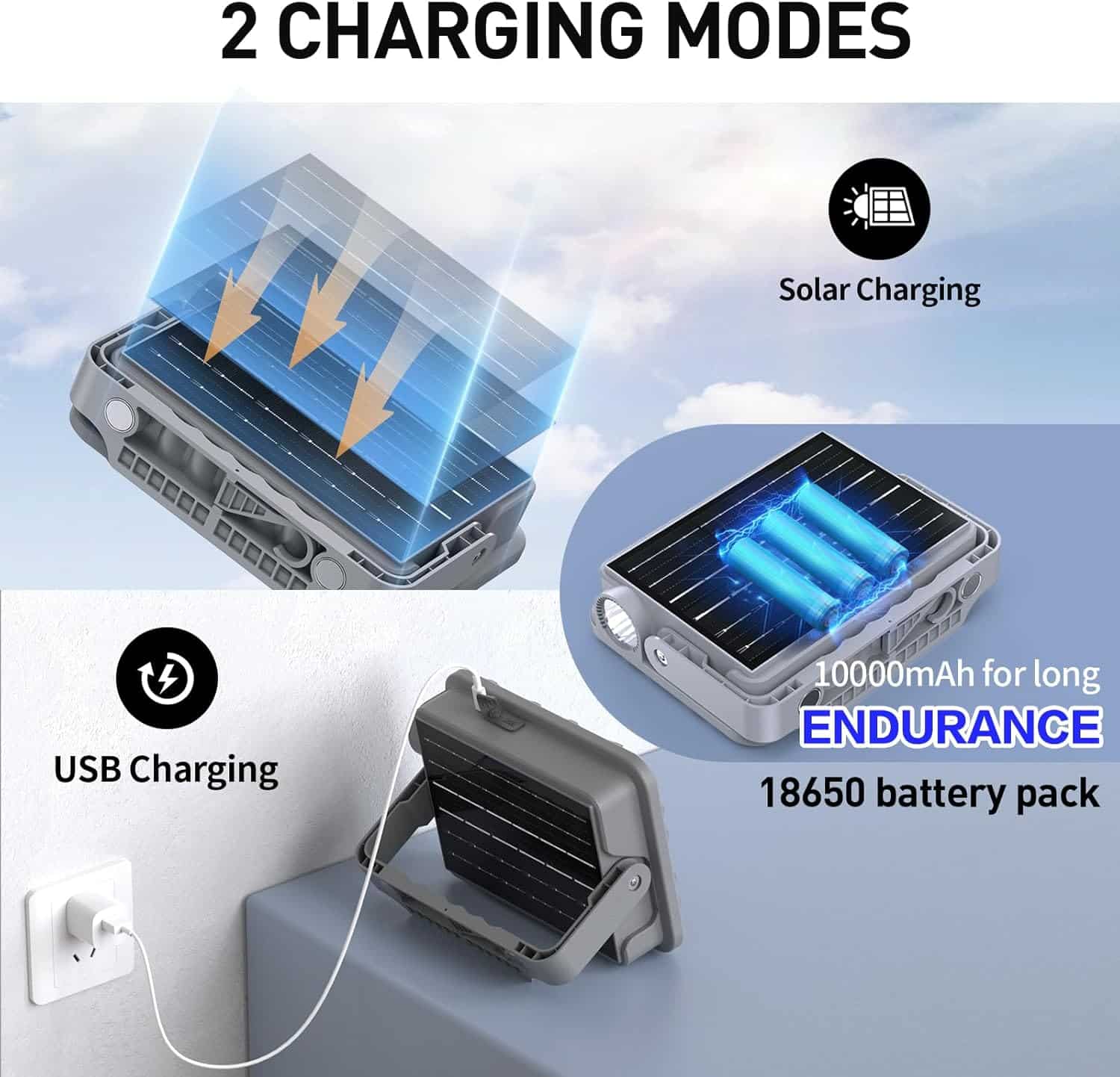 تفريغ USB وشحن USB من النوع C يجعل مدخل ومخرج USB الشحن أكثر ملاءمة، يمكنك اختيار الطاقة الشمسية وUSB بطريقتين لشحن مصباح العمل هذا. يمكن استخدامه أيضًا كبنك طاقة، لذلك لا داعي للقلق بشأن انقطاع التيار الكهربائي عند الخروج، وهو مناسب للتخييم وصيد الأسماك والرحلات القصيرة الأخرى